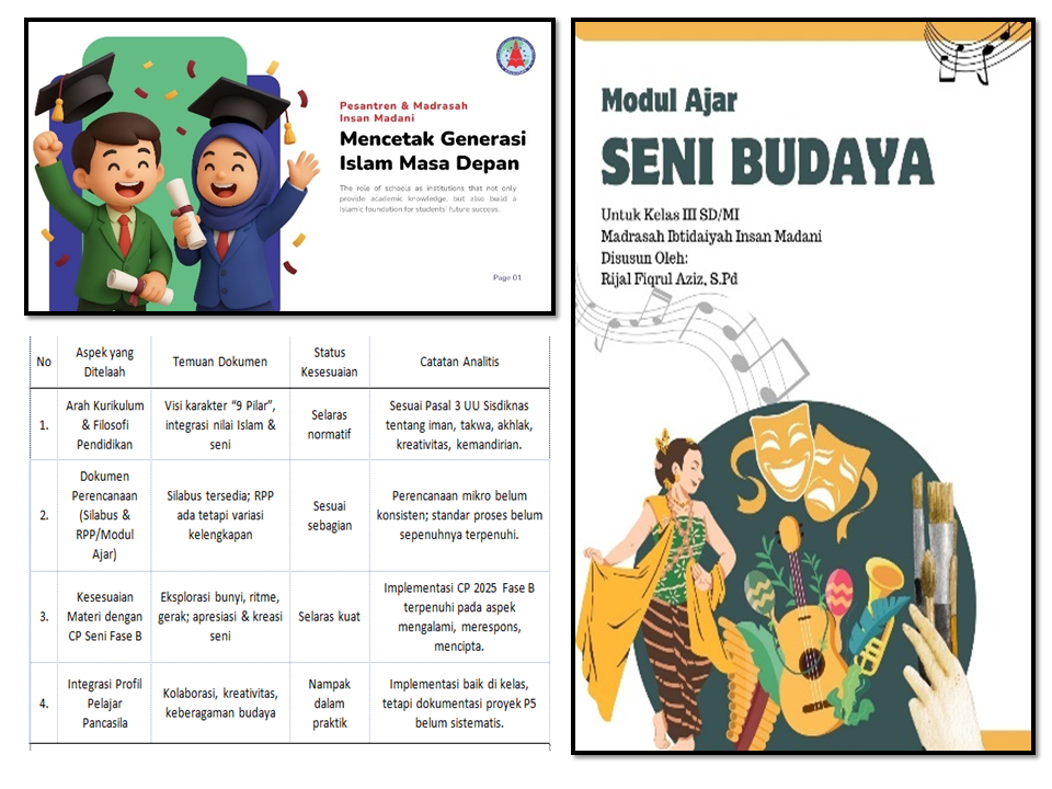 This study aims to conduct a juridical analysis of the implementation of national education goals within arts learning in primary schools by examining the alignment between educational regulations and classroom practice. The analysis is grounded in the Indonesian National Education System Law (Law No. 20 of 2003), which emphasizes holistic student development encompassing intellectual, creative, moral, and social dimensions. The research was conducted at MI Insan Madani Bandung using a qualitative method combined with a normative–empirical juridical approach. Data were collected through direct classroom observation of arts learning in Grade III, analysis of curriculum documents and educational regulations, and field notes. The observation instrument was constructed based on indicators of National Education Goals, the Outcome-Based Education (OBE) framework, and the National Education Standards (SNP). Data validity was strengthened through source and technique triangulation by comparing observations, learning documents, and regulatory frameworks. The findings show that the implementation of arts learning has fulfilled several normative aspects, particularly in the domains of psychomotor development, instructional processes, teacher competence, and authentic assessment. However, significant normative–empirical gaps were identified in creativity, learner autonomy, conceptual understanding, and the adequacy of learning facilities, preventing the national education goals from being fully achieved. The juridical analysis further reveals that these conditions have implications for the unfulfilled rights of students in developing creativity and for the failure to meet the minimum facility standards stipulated in the SNP. This study provides theoretical and practical contributions by offering a comprehensive understanding of the relationship between regulatory frameworks, curriculum policy, and the actual implementation of arts learning in primary schools, thereby serving as a basis for improving instructional quality and strengthening educational policy.